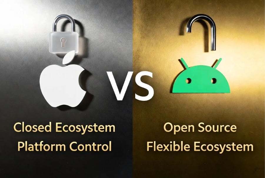 The main differences between the two platforms mainly depend on the type of system, security, customization, and device diversity. iOS is a closed ecosystem, which provides more secure, fast, and stable performance, where updates reach all devices at the same time. On the other hand, Android is open-source, so users can use it on devices of different brands and customize it easily. It also provides more freedom in terms of app installation, file management, and user control, which is considered a big advantage for many users.